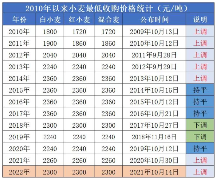 10月14日,國家發(fā)展改革委等公布2022年小麥最低收購價格的通知,2022年生產(chǎn)的小麥(三等)最低收購價為1.15元/斤,較2021年小麥最低收購價1.13元/斤提高0.02元/斤。限定收購總量為3700萬噸,分兩批次下達,第一批數(shù)量為3330萬噸,不分配到省;第二批數(shù)量為370萬噸,視收購需要具體分配到省。