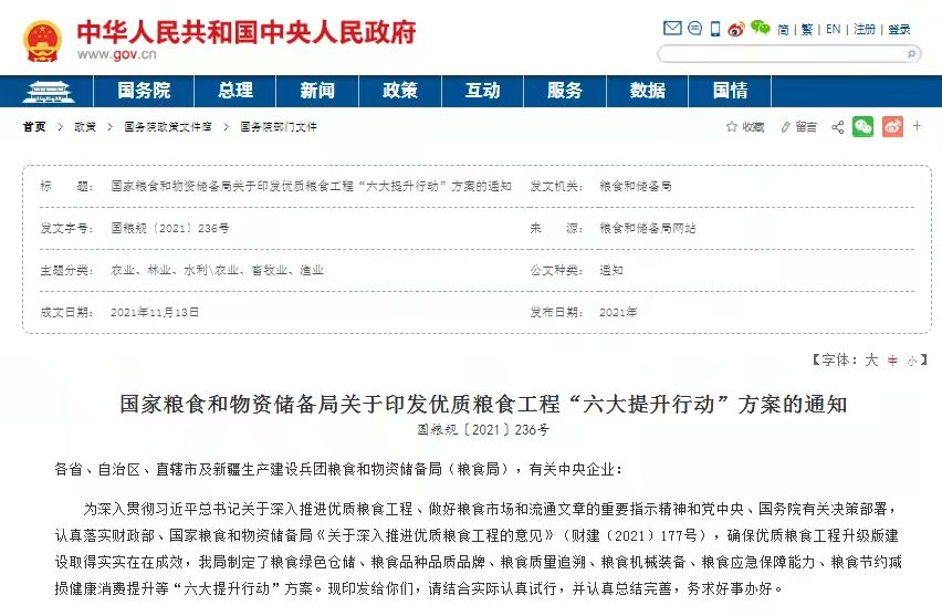 ——《糧食品種品質品牌提升行動方案》:持續開展“中國好糧油”行動,聚焦增加綠色優質糧油產品供給,著力優化糧食供給結構,促進糧油品質提升,打造優質糧食品牌,搞活糧食市場和流通,加快糧食產業創新發展、轉型升級、提質增效。到2025年,優質糧食供給更加豐富,糧食品質明顯提升,糧食品牌體系更加完善,糧油品牌和營銷市場競爭力持續提升。充分融合“好糧油”銷售示范點、糧食應急供應網點、軍糧供應網點和主食廚房等,健全線上線下營銷體系,加快由“吃得飽”向“吃得好”“吃得營養健康”轉變。