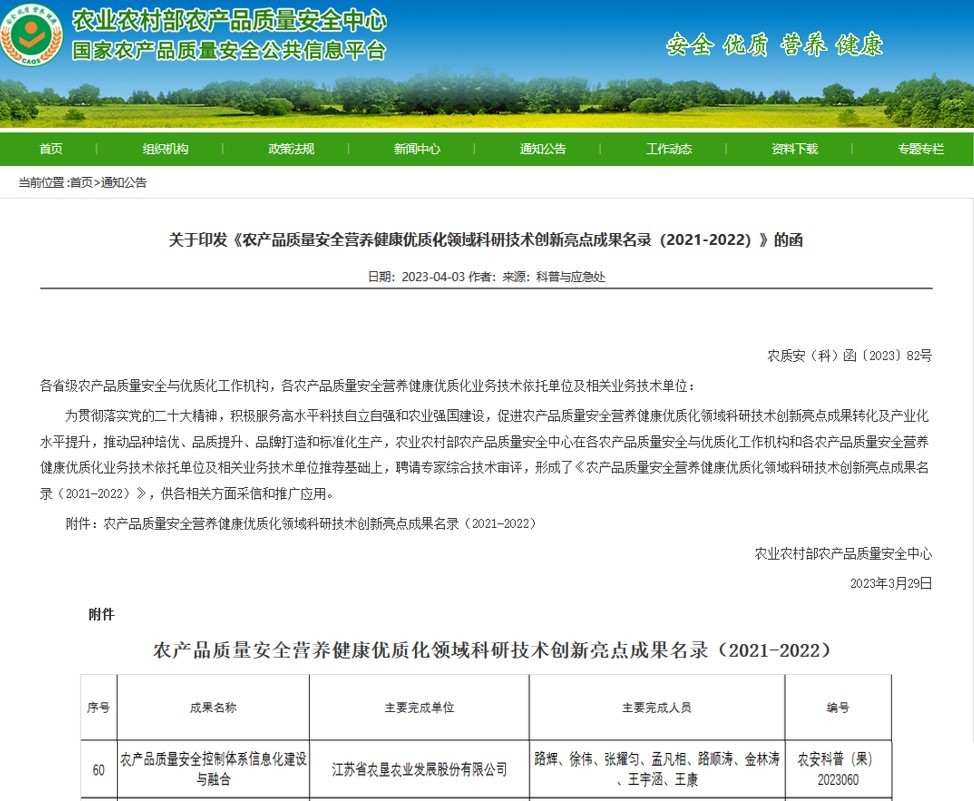 •        2023年4月3日,蘇墾農發“農產品質量安全控制體系信息化建設與融合”創新成果成功入選農業農村部《農產品質量安全營養健康優質化領域科研技術創新亮點成果名錄(2021-2022)》。據悉,該目錄每2年評審一次,全國63個成果、江蘇省3個成果入選,蘇墾農發首次入選該名錄,是省內唯一一個入圍的企業單位。