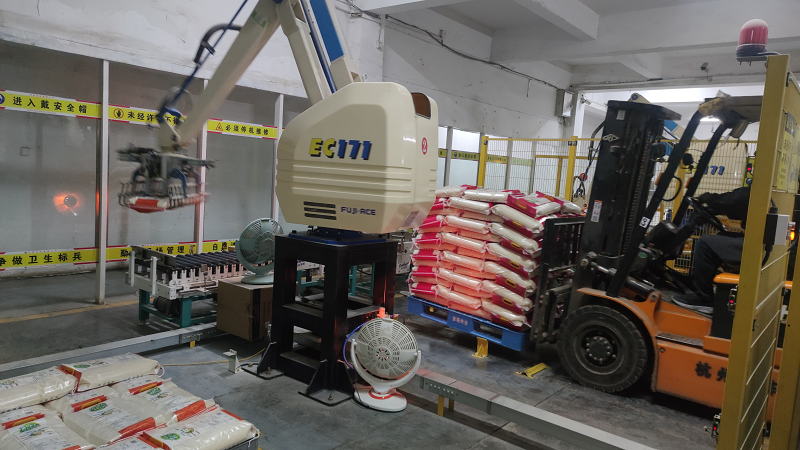 高標準農業現代化設備保障加工效能。添袋、灌裝、封口、機械臂堆碼,無人化大米生產加工線一氣呵成,操作工仔細巡視高速運轉的生產設備,不斷調整設備參數和流量,提高設備運行效率,保障產量不斷提升。