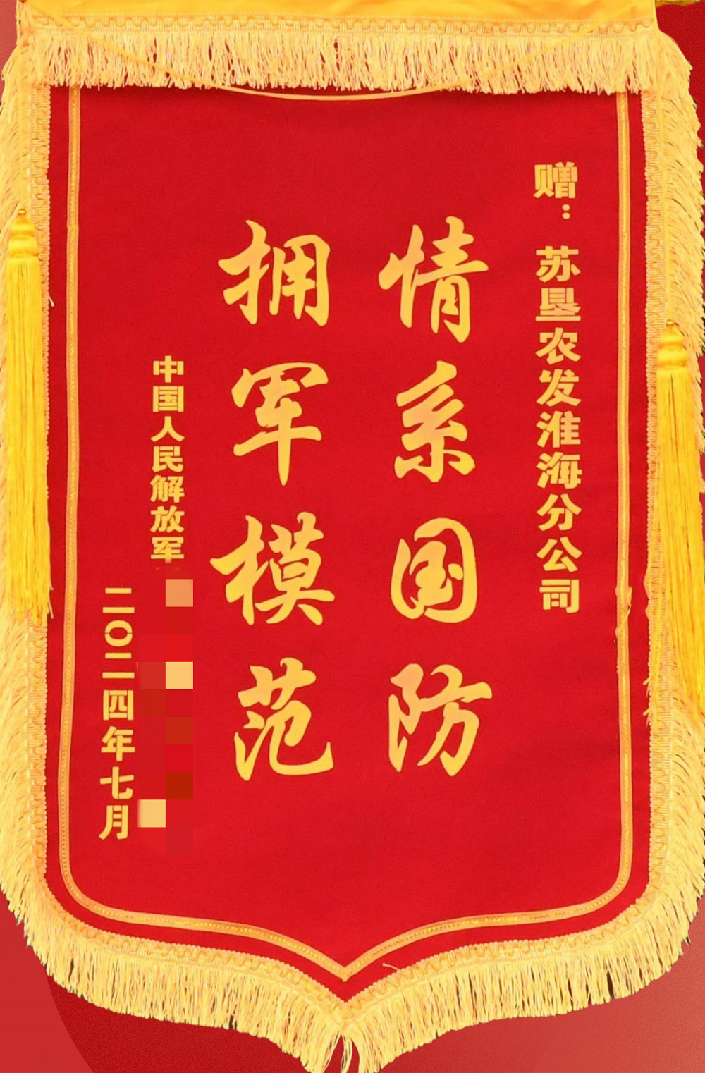•        昔日屯墾戍邊地,今朝用情暖軍心。7月22日下午,蘇墾農發淮海分公司總經理仰海洲收到了一面來自中國人民解放軍陸軍某部、題為“情系國防 擁軍模范”的特殊錦旗。在贈旗儀式上,該部負責人深情地說:“這次駐訓的圓滿完成,離不開貴單位的大力支持,你們的付出為我們解決了后顧之憂,讓我們能夠全身心投入到訓練和任務中,這面錦旗不僅代表著我們的感謝,更是軍民深厚魚水情的生動見證。”