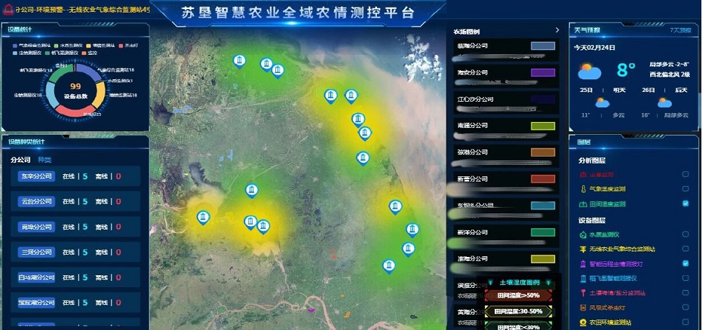 圍繞保障糧食安全核心功能,由公司黨委抓總、總部科技信息部負責總體架構,集成應用低空農業、無人化裝備、人工智能技術,搭建智慧農業“一張圖”“一片云”“一張網”共性平臺,開發應用無人值守巡田系統、全域“四情”監測系統、智慧灌溉系統,推廣精準變量施肥、衛星平整地、北斗輔助駕駛技術裝備,多維度提升農業生產效率與管理水平,輸出江蘇農墾智慧農業集成解決方案。