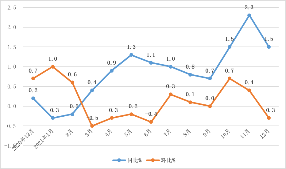 2021年12月份,全國居民消費價格同比上漲1.5%。其中,城市上漲1.6%,農村上漲1.2%;食品價格下降1.2%,非食品價格上漲2.1%;消費品價格上漲1.5%,服務價格上漲1.5%。