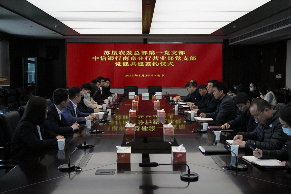 2月25日,蘇墾農發總部第一黨支部與中信銀行南京分行營業部黨支部舉行黨建共建簽約儀式。簽約前,蘇墾農發總部第一黨支部書記劉剛和中信銀行南京分行營業部黨支部書記張磊各自介紹了支部基本情況,并就黨員隊伍建設、黨建工作開展以及黨建業務融合促進等方面內容作交流。隨后,雙方代表簽訂《黨建共建協議書》,并互贈黨建書籍。