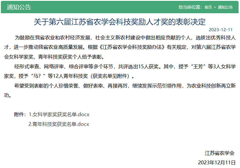 12月11日,第六屆江蘇省農學會科技獎勵成果獎和第六屆江蘇省農學會科技獎勵人才獎獲獎名單公布,蘇墾農發作為第一完成單位申報的“稻麥植保無人飛防高質高效作業技術集成與推廣”成果榮獲技術推廣獎二等獎、“江蘇農墾綠色低碳生產關鍵技術集成與推廣”成果榮獲技術推廣獎三等獎,蘇墾農發現代農業研究院朱松同志榮獲青年科技獎。
