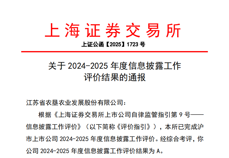 近日,上海證券交易所公布滬市主板上市公司2024-2025年度信息披露工作評價結(jié)果,蘇墾農(nóng)發(fā)(股票代碼:601952)再次獲評最高等級“A”級。至此,公司已連續(xù)六年蟬聯(lián)上交所信息披露最高評級。
